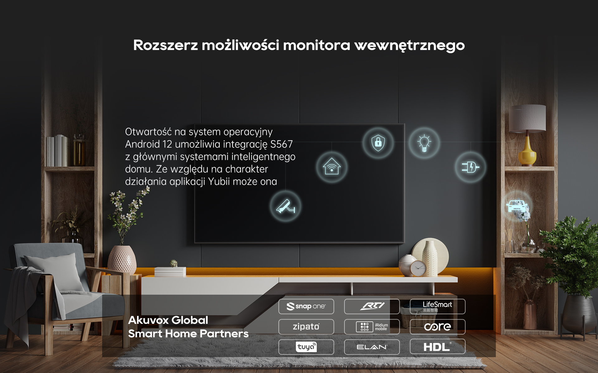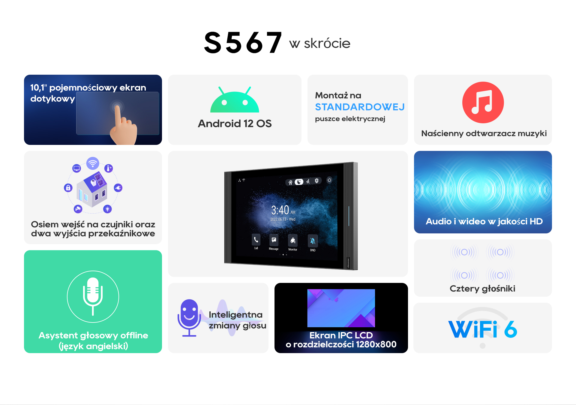 Monitor wewnętrzny Akuvox S567 o przekątnej 10 cali działa na wiodącym w branży systemie operacyjnym Android 12 i jest wyposażony w technologię komunikacji Wi-Fi 6. Połączenie dwóch mikrofonów i czterech głośników zapewnia doskonałą jakość dźwięku. Dzięki minimalistycznemu wzornictwu S567 dobrze komponuje się z każdym nowoczesnym wystrojem wnętrza.