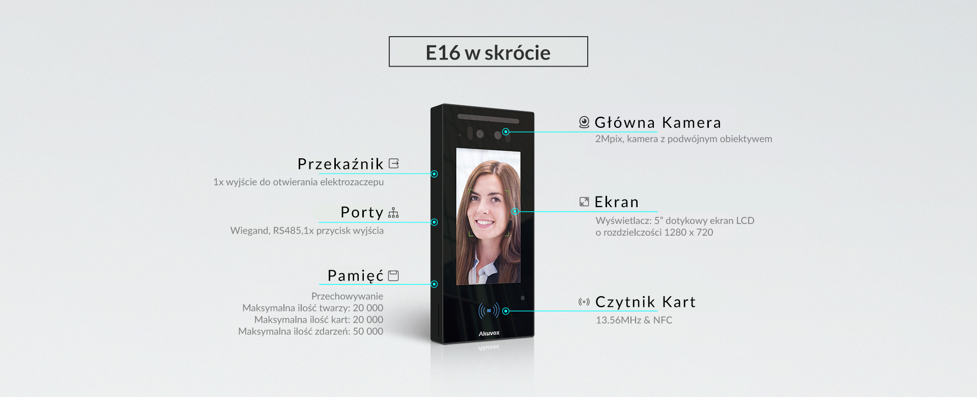 E16 to niedrogi domofon z funkcją rozpoznawania twarzy, który oferuje doskonałą komunikację interkomową i elastyczne metody kontroli dostępu, takie jak rozpoznawanie twarzy oparte na sztucznej inteligencji i aplikacja mobilna. Jest zwykle używany w zastosowaniach komercyjnych i mieszkaniowych.