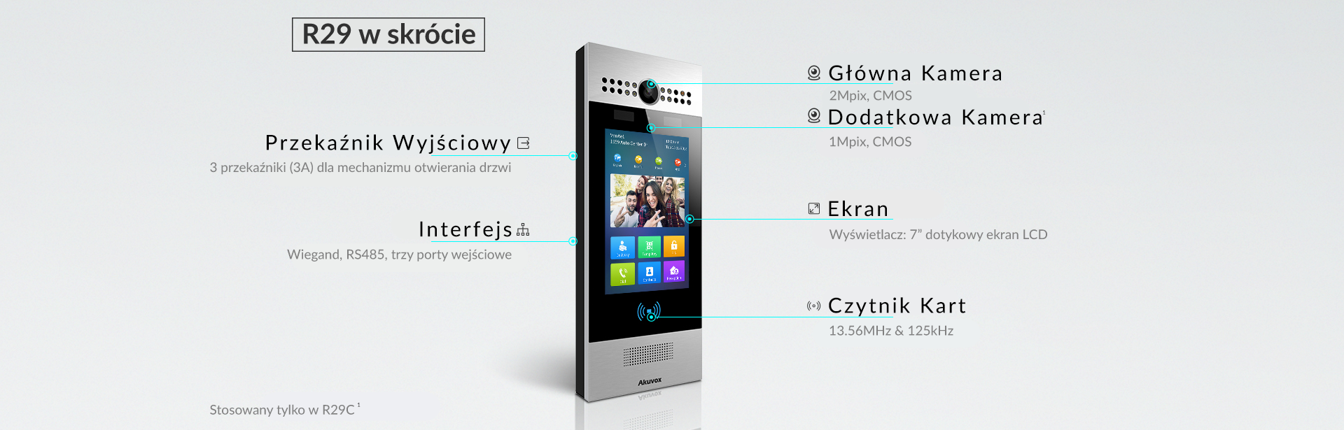 Akuvox R29 to wideodomofon SIP z 7-calowym ekranem dotykowym, który rozpoznaje twarz w trybie offline w oparciu o sztuczną inteligencję w celu uzyskania dostępu do drzwi. Jest zwykle stosowany w budynkach mieszkalnych, wysokich biurowcach i kompleksach budynków.